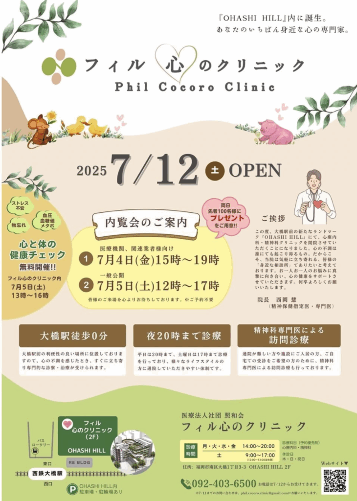 福岡市南区大橋の精神科・心療内科『フィル心のクリニック』の新規開院に先立ち、どなたでもご参加いただける内覧会を開催いたします